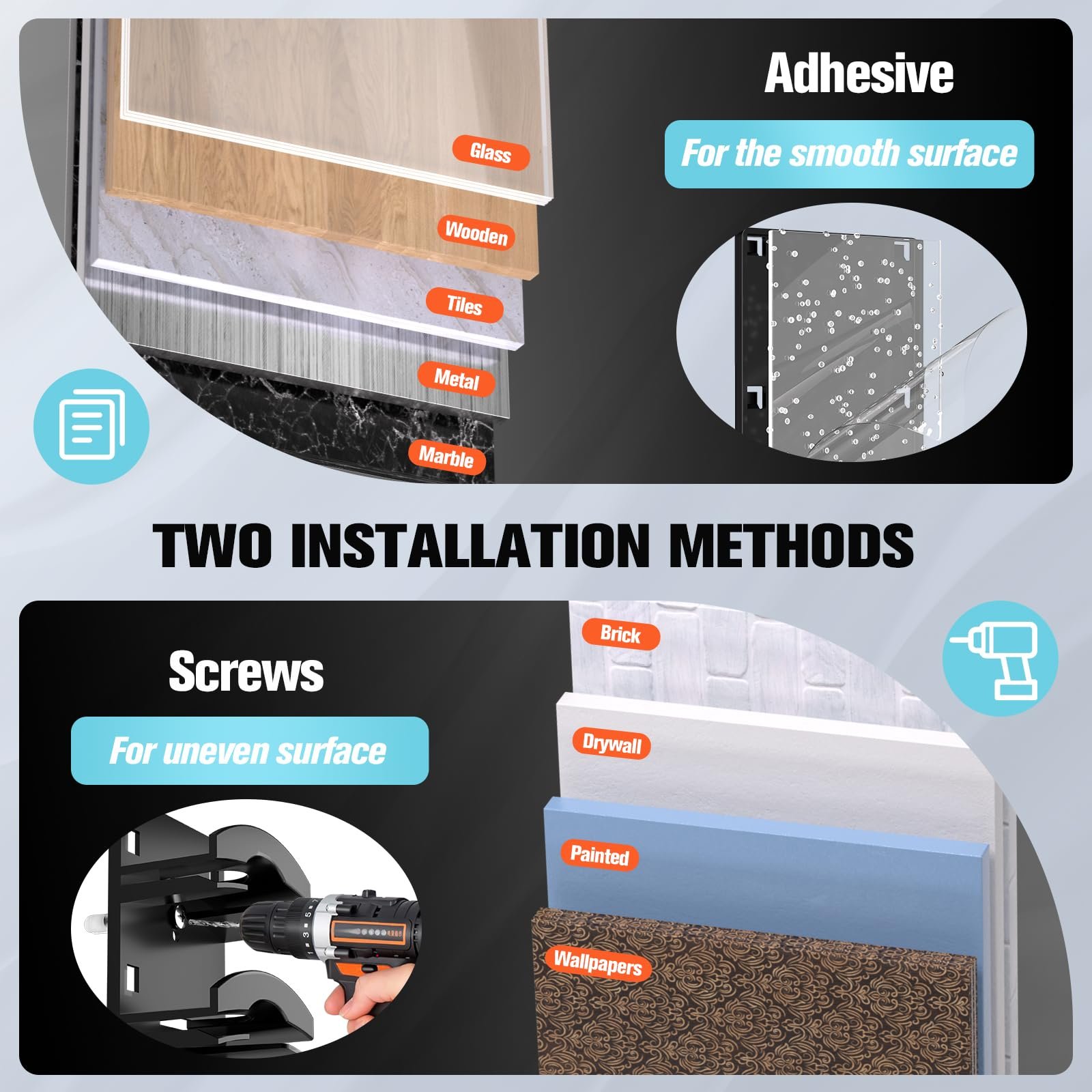 🛠️ Dua Metode Pemasangan: Tempelkan dengan perekat yang kuat atau gunakan dudukan sekrup untuk permukaan yang tidak rata. Cukup pilih metode yang tepat dan pasang sekali saja.