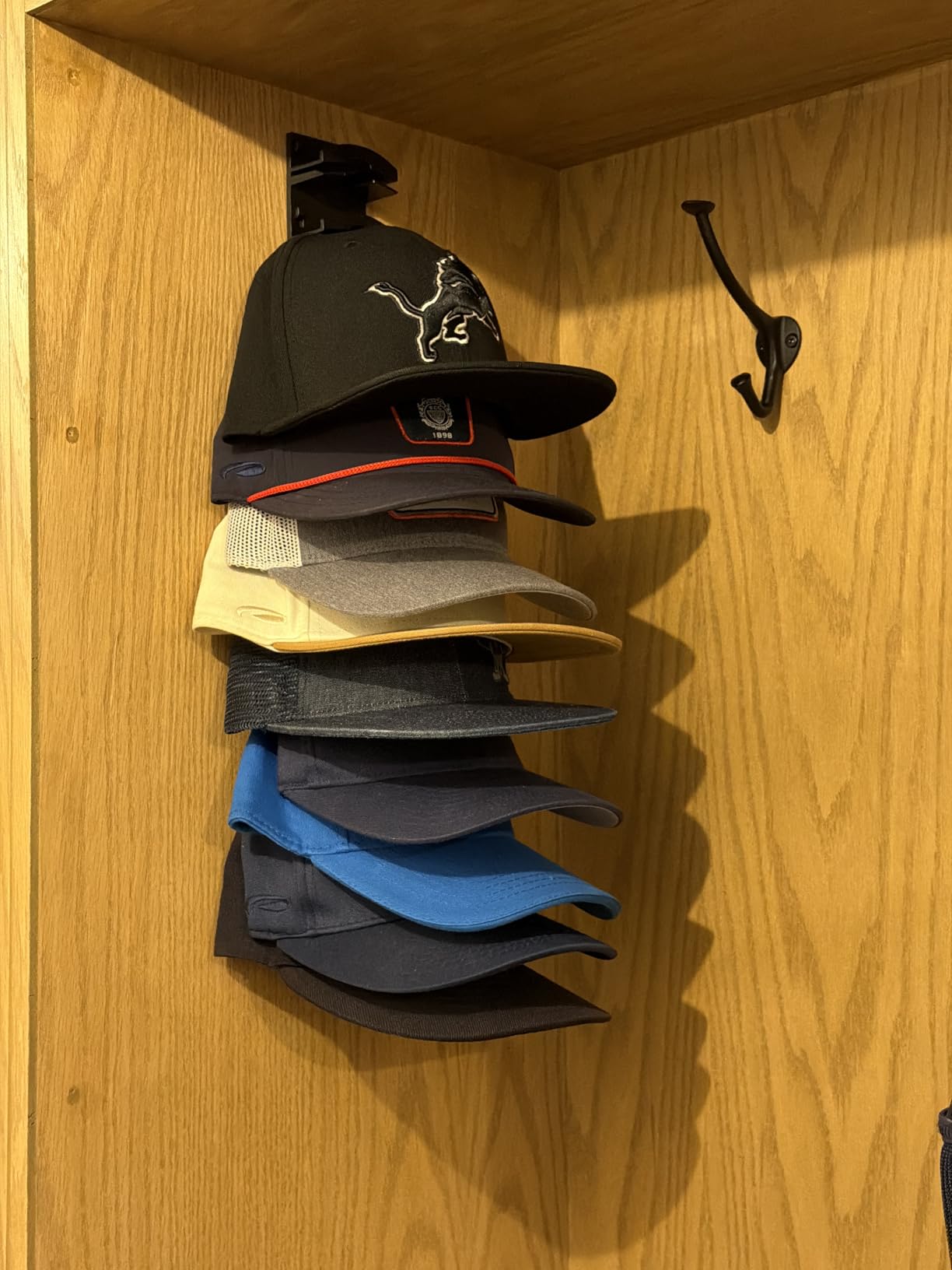 🧢 Satu Topi Per Lapisan, Akses Mudah: Tidak perlu lagi menumpuk atau mencari-cari—setiap topi memiliki tempatnya masing-masing. Bahkan topi paling bawah pun tetap bersih dan mudah diambil.